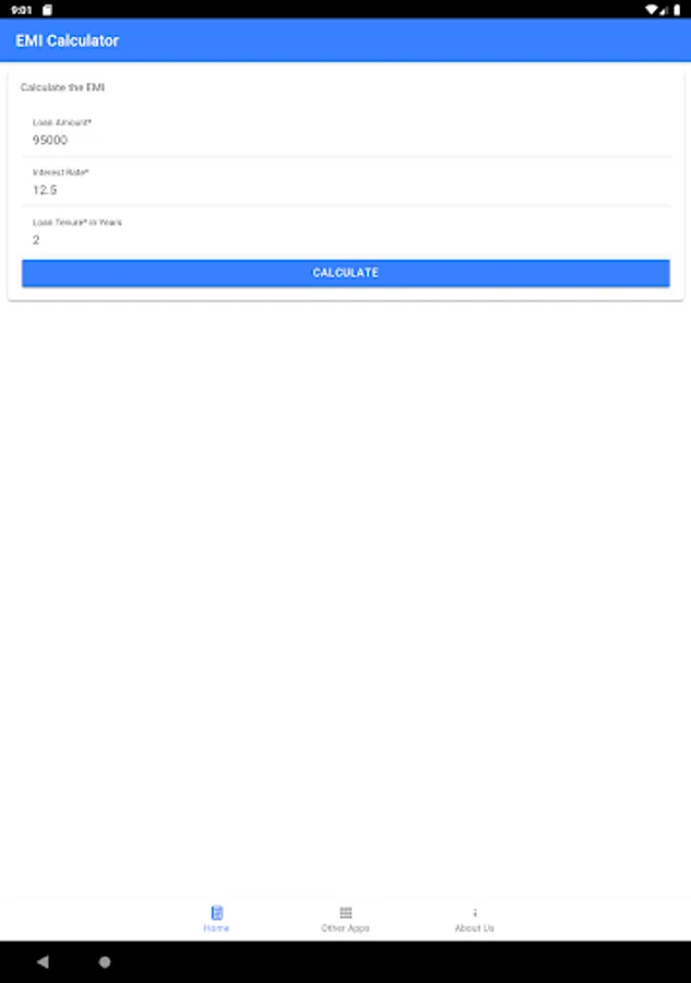 Using the Loan EMI Calculation application is an very simple step. Just open the application and provider the following information in the first page i.e Total Loan amount you're going to borrow from the bank, Interest amount for the loan and tenture for the loan in terms of years and press the submit button.