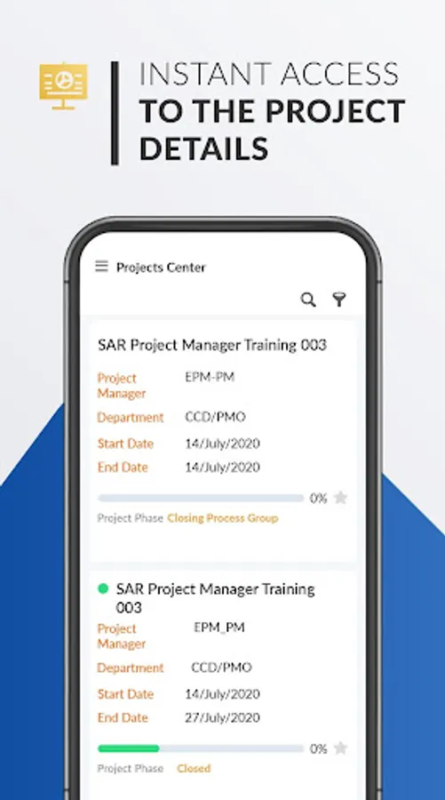 For the project management officer officers. SAR-EPM Mobile Application provide all features and functionalities provided to the project manager in addition to a comprehensive dashboard the gives the project management officer officers deep insights on the projects statuses and their progress, in addition to that the application provide a very good search capabilities on the project center to search and filter the projects.