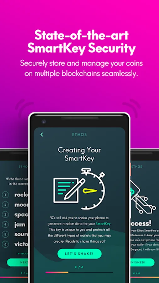 STATE-OF-THE-ART SECURITY - No more managing multiple private keys and wallets. With the Universal Wallet, you generate a single Ethos SmartKey for each wallet instance you create, and it takes care of the rest – providing automated maximum security management of all of your digital assets. You remain in complete control at all times. Lose your phone? Simply restore your cryptocurrency wallet and regain control of your funds using your Ethos SmartKey. Self-Custody at its finest!