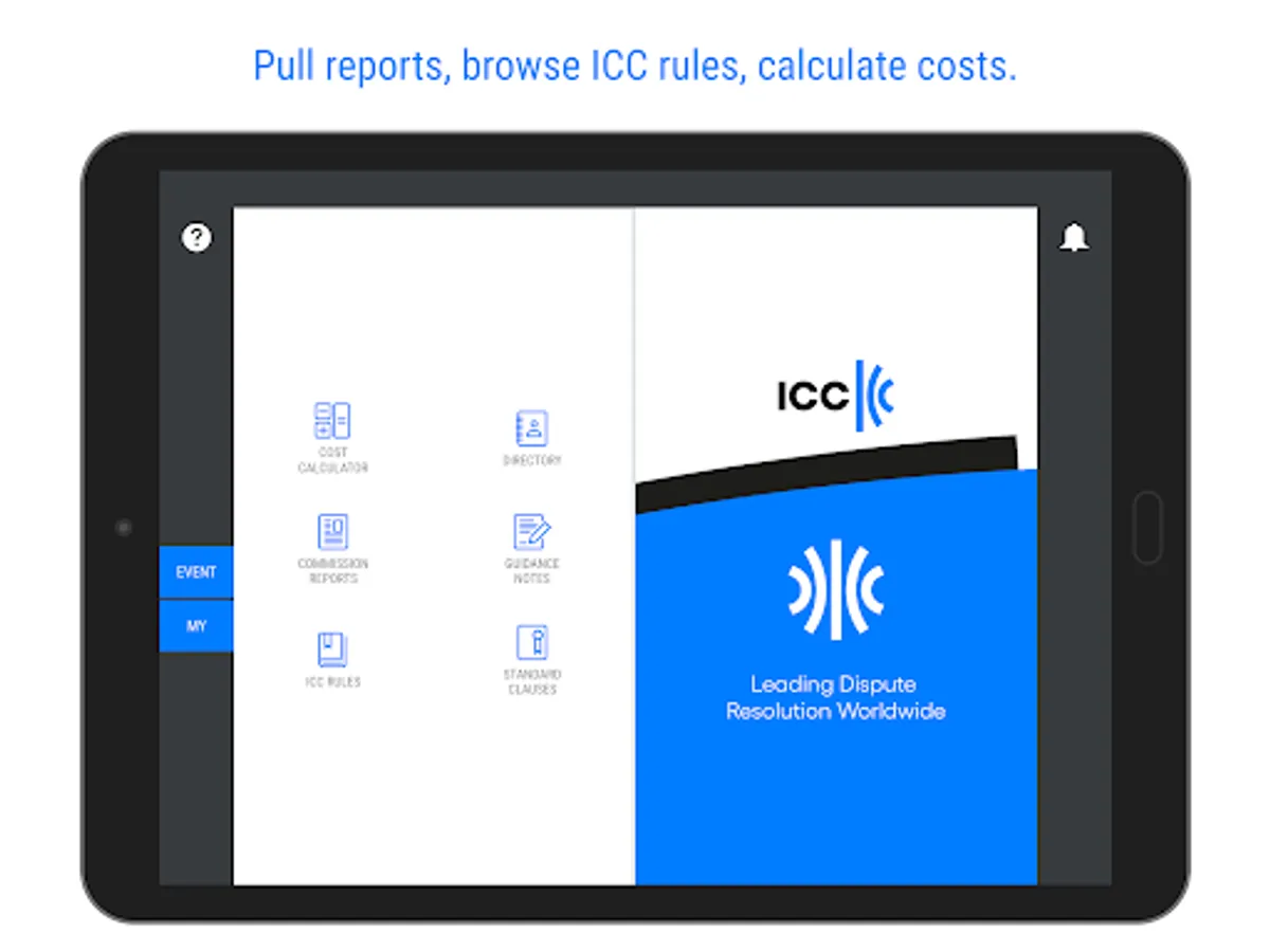 Our ICC DRS app, or ICC Dispute Resolution Services (DRS) app, is an on-the-go tool for improving productivity for busy professionals worldwide. Accessible anytime, anywhere, the app blends together an all-in-one workspace that includes everything an arbitrator, mediator or user would need to know about ICC’s dispute resolution services with an events tool to access essential conference and training information and connect with fellow participants.