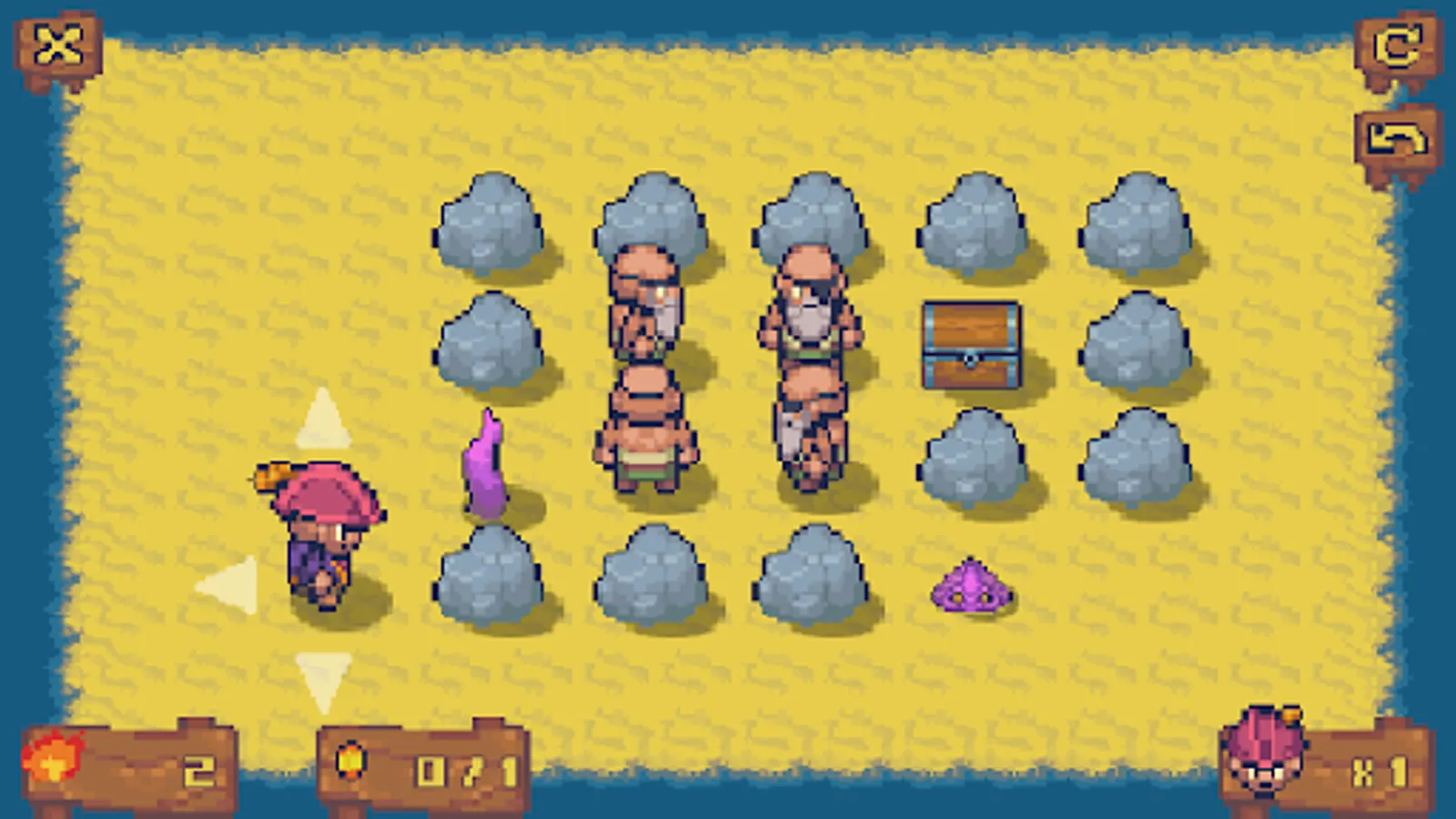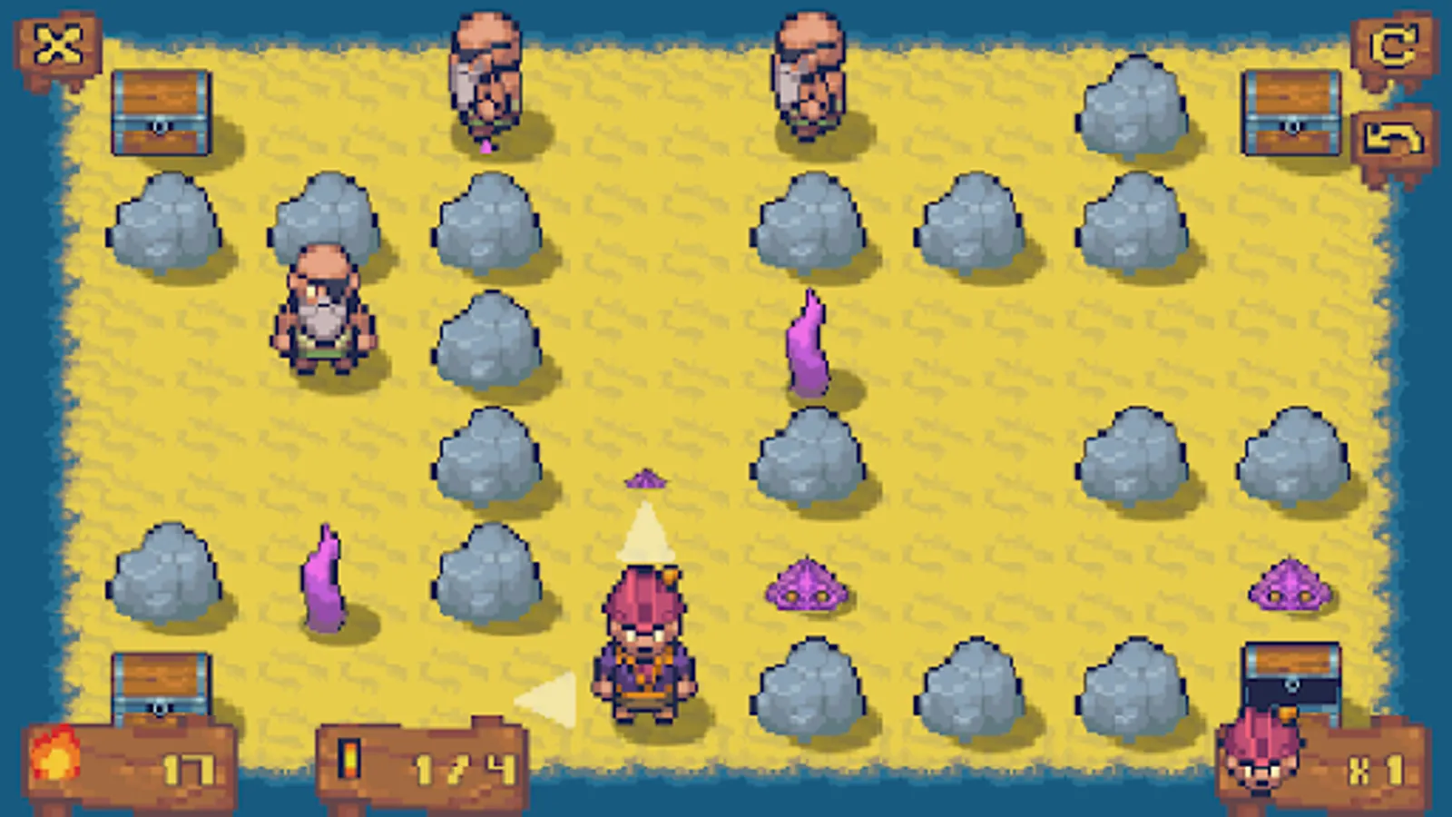 Swipe anywhere on the screen to move, but try and dodge the pirates. Step on the squids, and move the crates to get all the chests. Don't be scared to undo your last move or even restart the level if you are stuck.