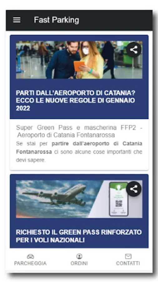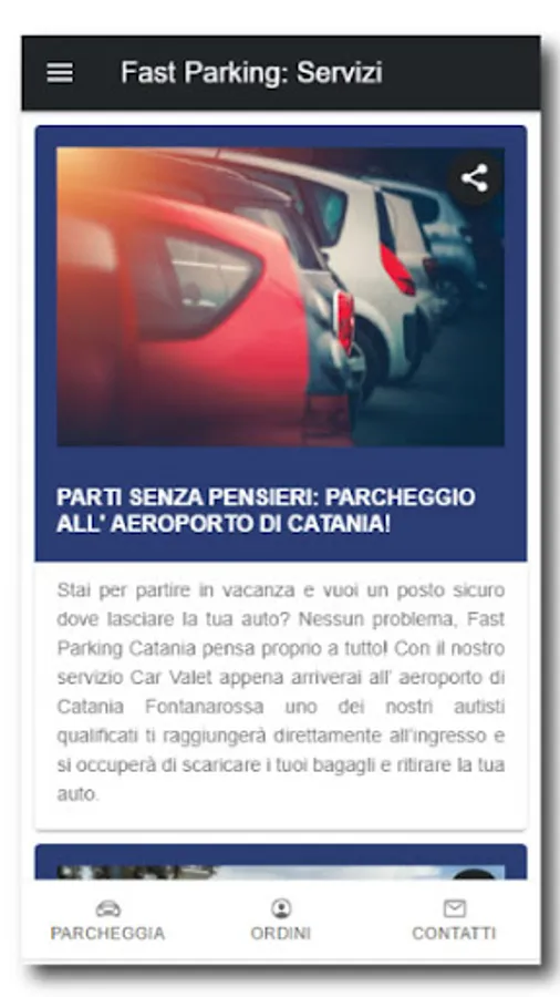 With the Fast Parking Catania application you will always be updated on the news regarding the parking service and more. Through the app you can book your parking just 500 meters from Catania Fontanarossa airport. Stay up to date and always receive notifications and discount coupons!
