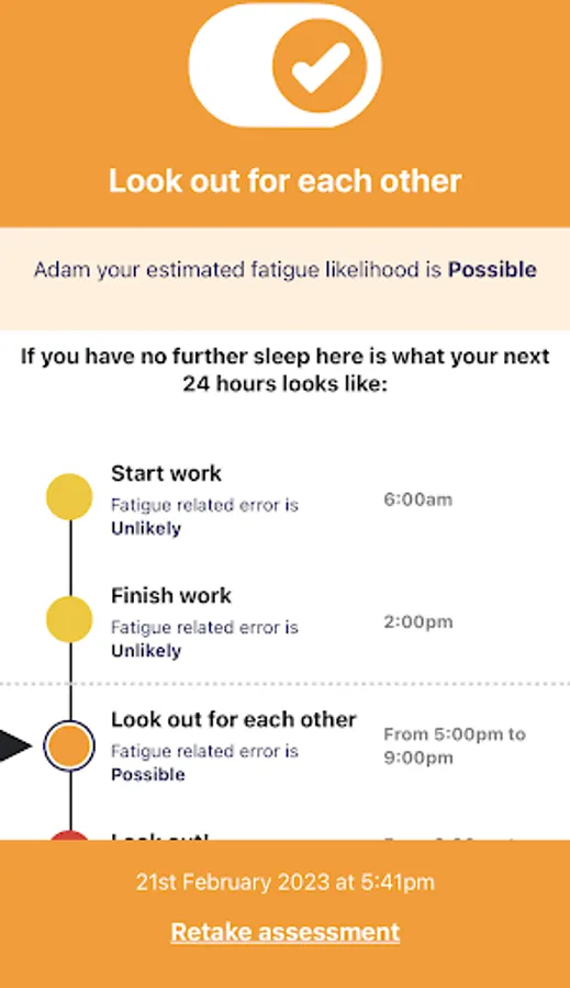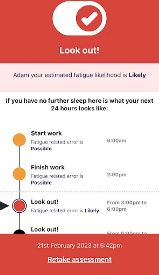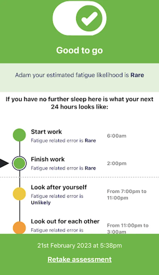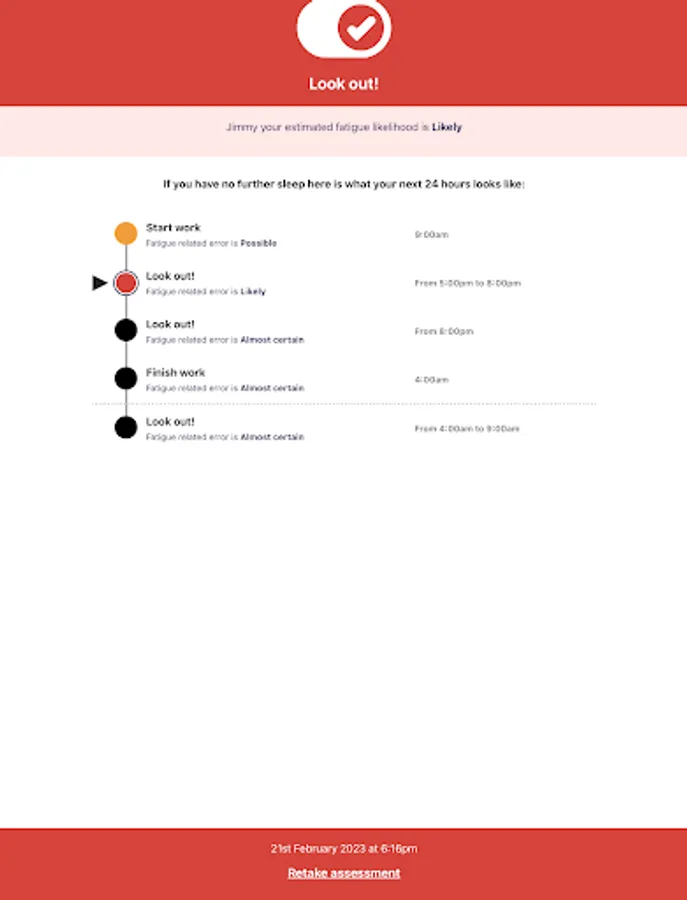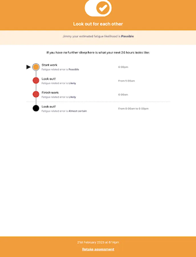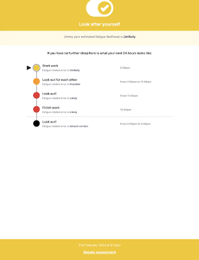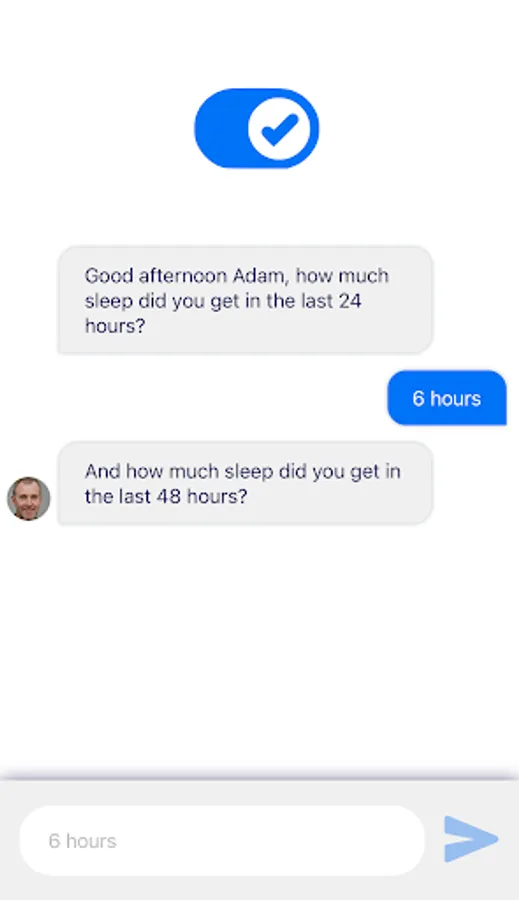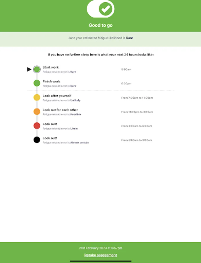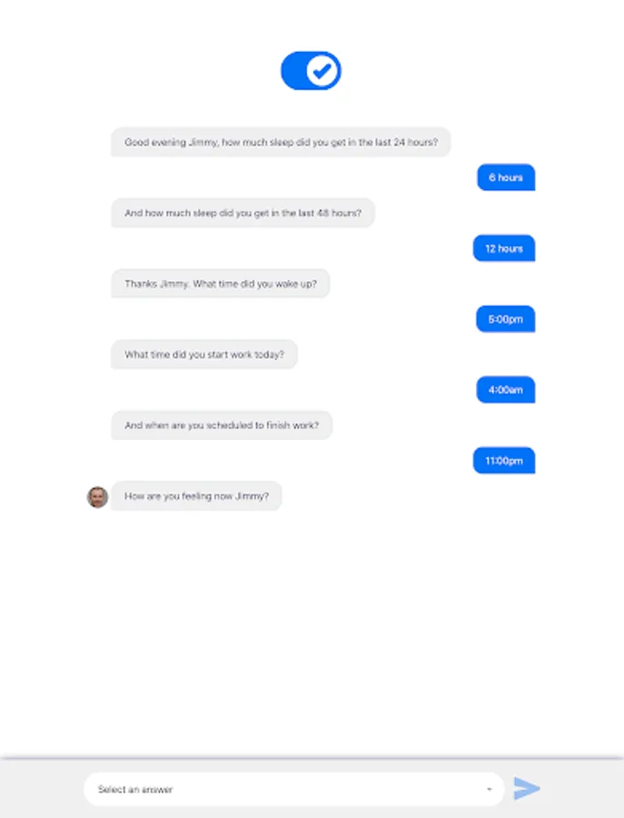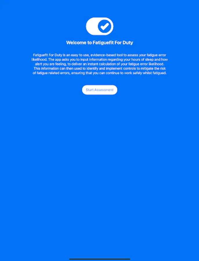· Quickly and easily assess your level of fatigue error likelihood through scientifically validated chat-bot led questions.