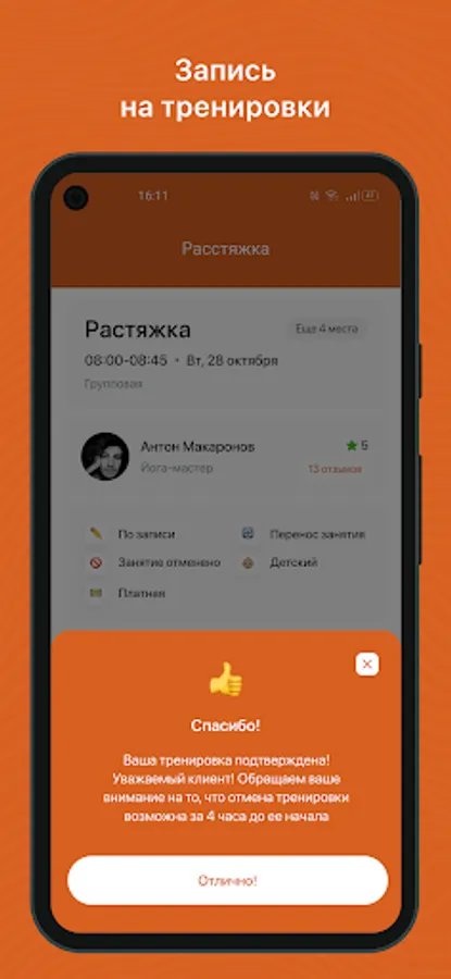 - Receive PUSH notifications about an upcoming workout 3 hours in advance;