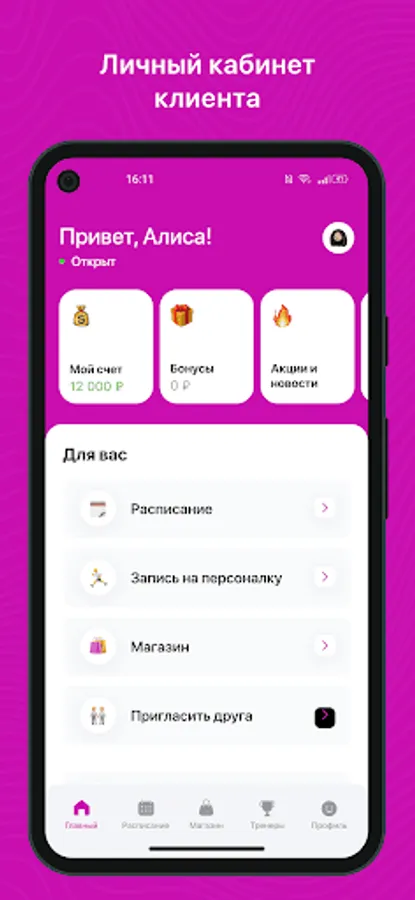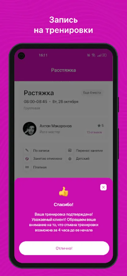 Receive PUSH notifications about an upcoming workout 3 hours in advance;