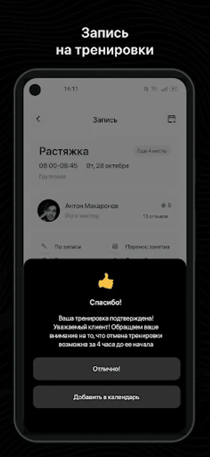 - Receive PUSH notifications about an upcoming workout 3 hours in advance;