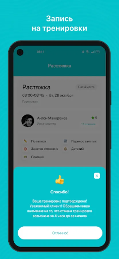 - Receive PUSH notifications about an upcoming workout 3 hours in advance;