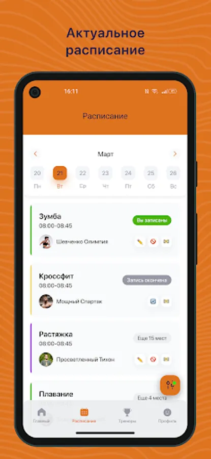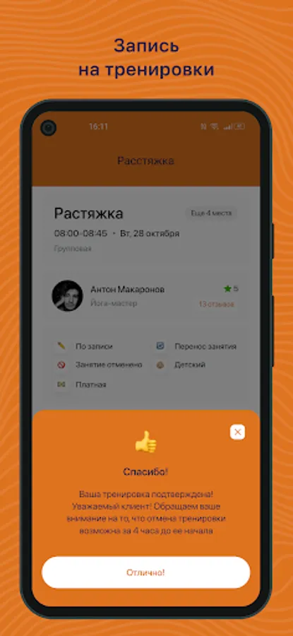 - Receive PUSH notifications about an upcoming workout 3 hours in advance;