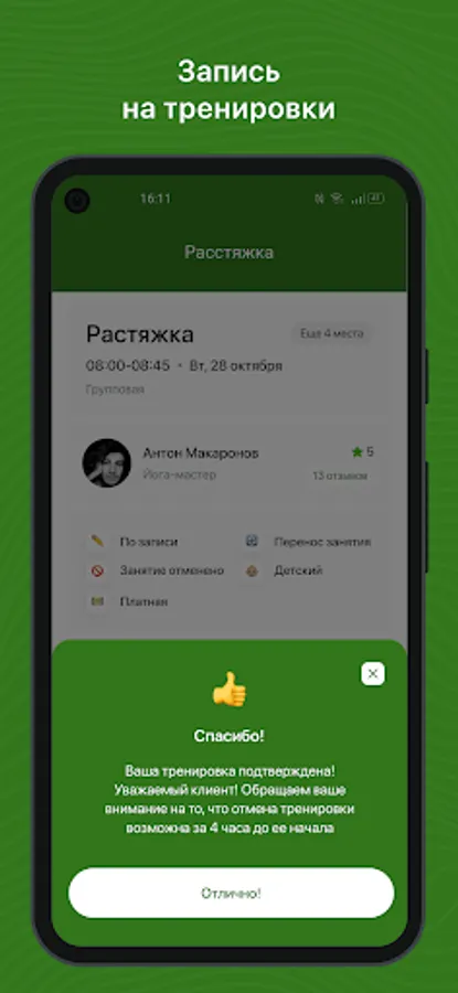 - Receive PUSH notifications about an upcoming workout 3 hours in advance;