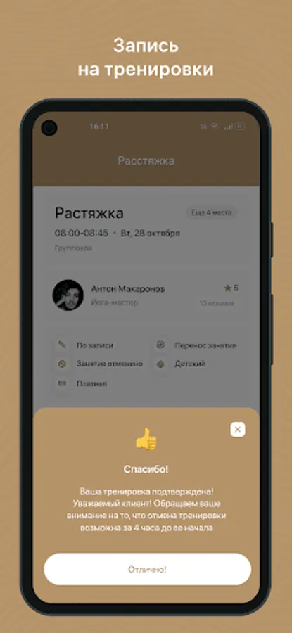 Receive PUSH notifications about an upcoming workout 3 hours in advance;