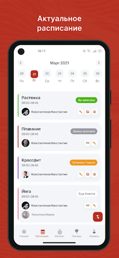 - Receive PUSH notifications about an upcoming workout 3 hours in advance;
