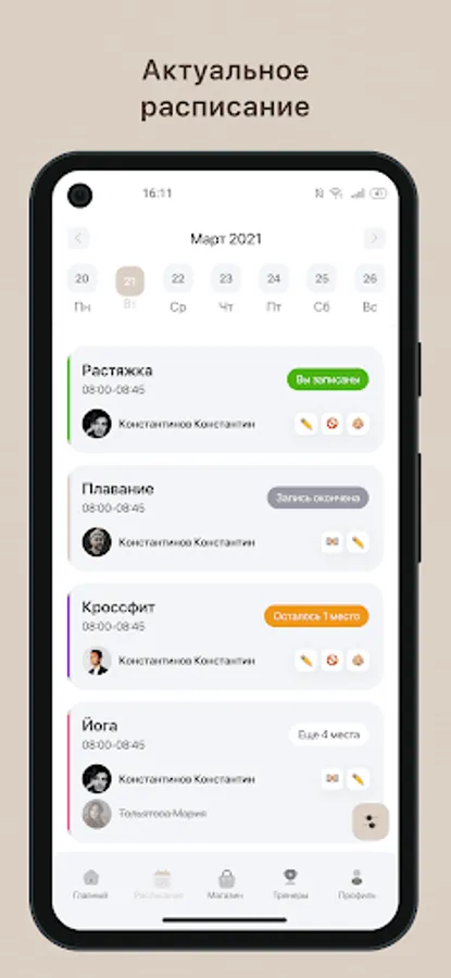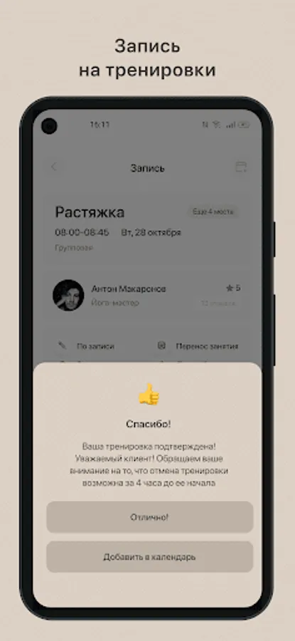 Receive PUSH notifications about an upcoming workout 3 hours in advance;