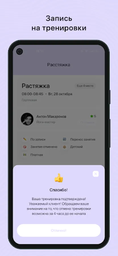 - Receive PUSH notifications about an upcoming workout 3 hours in advance;
