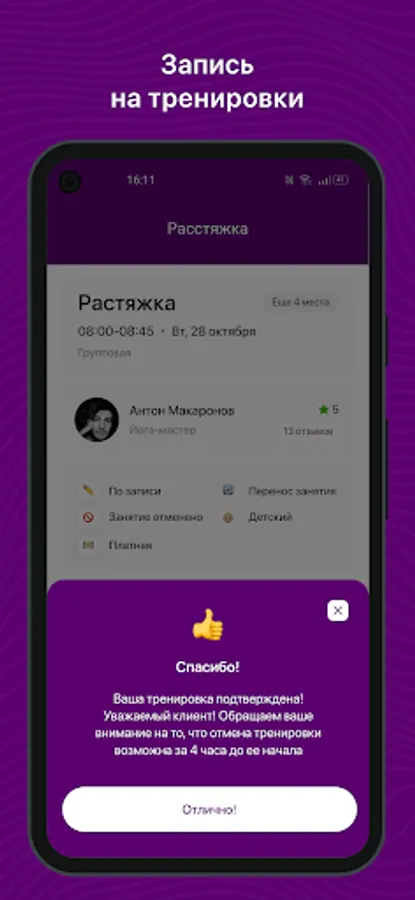 Receive PUSH notifications about an upcoming workout 3 hours in advance;
