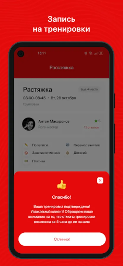 Receive PUSH notifications about an upcoming workout 3 hours in advance;
