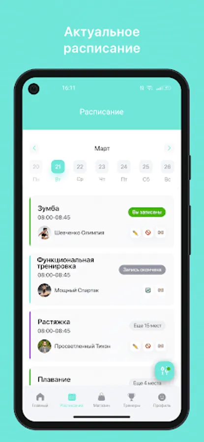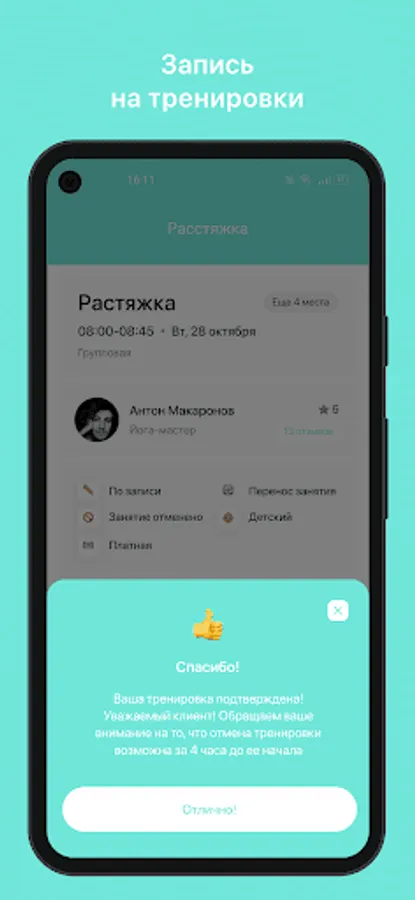 • Receive PUSH-notifications about the upcoming training in 3 hours;