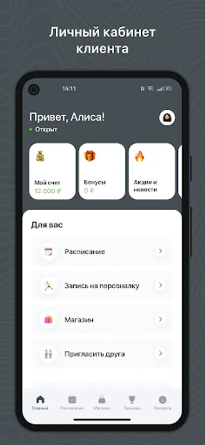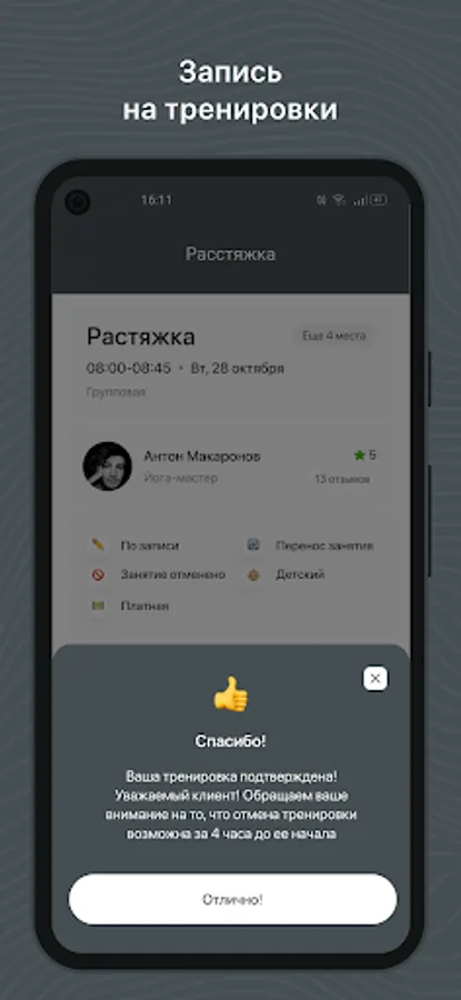- Receive PUSH notifications about an upcoming workout;