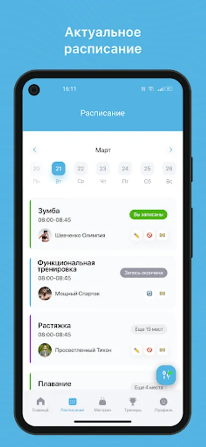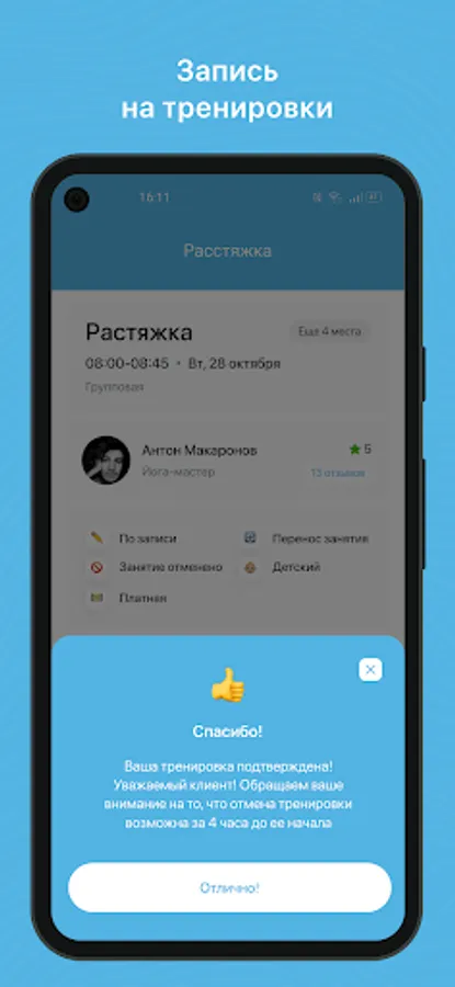 - Receive PUSH notifications about an upcoming workout 3 hours in advance;