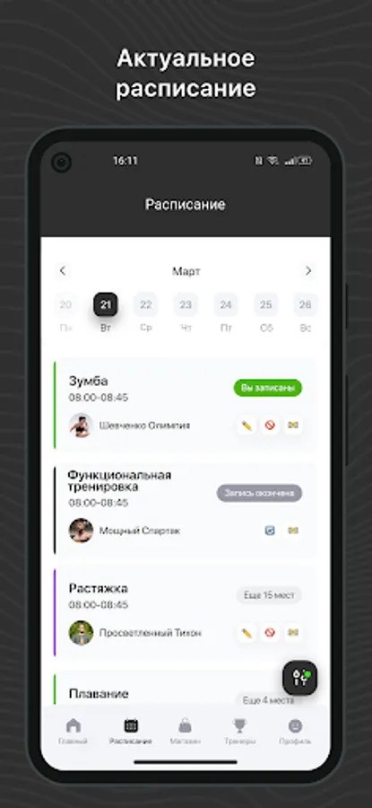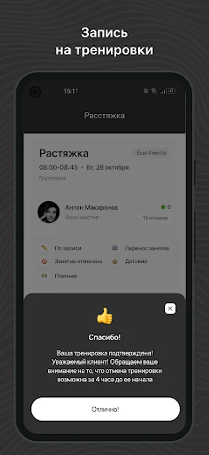 - Receive PUSH notifications about an upcoming workout 3 hours in advance;