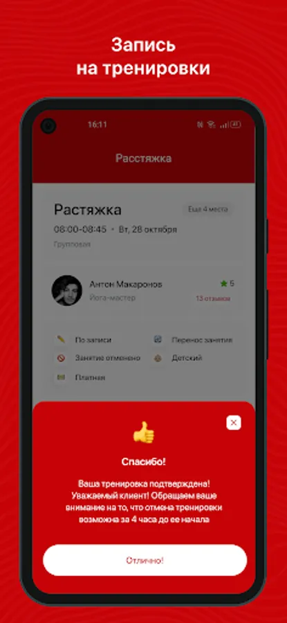 - Receive PUSH notifications about an upcoming workout 3 hours in advance;