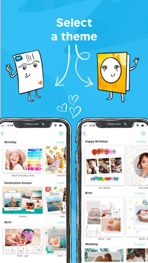 Personalize your cards and albums with your own photos. Write a message, add stickers and emojis, validate...and it’s sent in an envelope! Discover new designs made by our two illustrators all around the year.