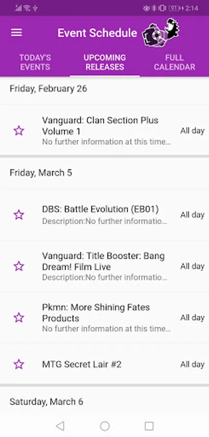 What day is that tournament again? When does that new set come out? Are there any macaroons today? All these questions and more answered in the palm of your hand! Use the Schedule to see a calendar of upcoming product releases, tournaments, and other events. Favorite which events you are interested in so you can keep track of the time and event details. The Latest News tab will keep you up to date on the Kafe goods, board game reviews, and new product without requiring any social media login.