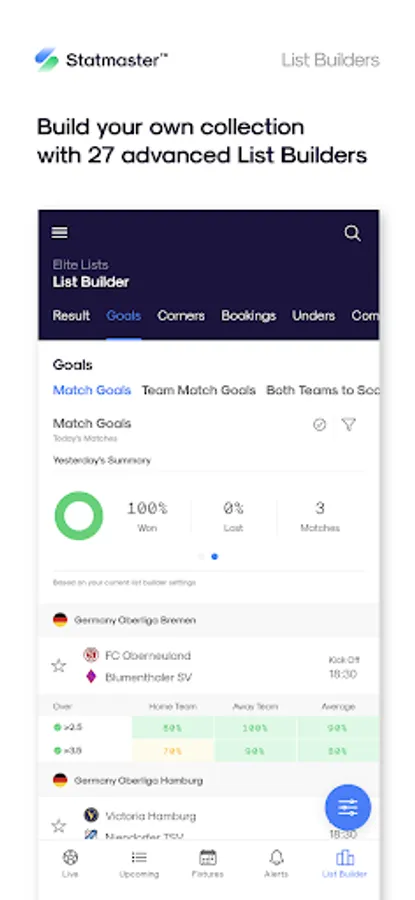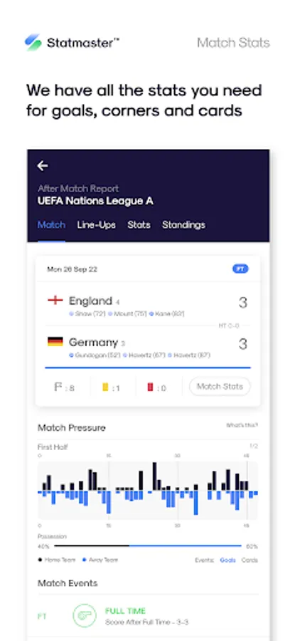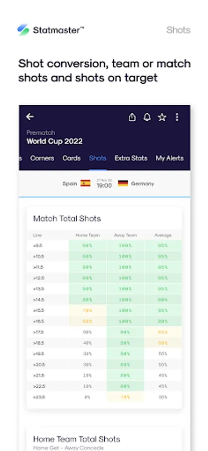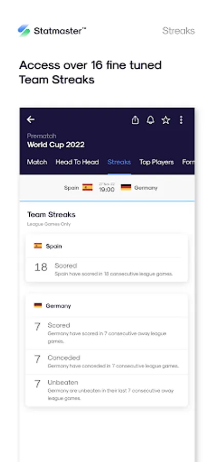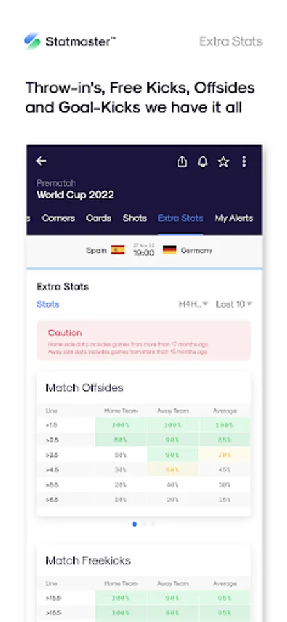 Individual Team Statistics, Heat Maps for goals, corners and bookings, Streaks and Line Ups.