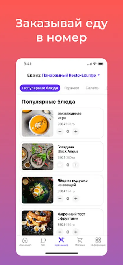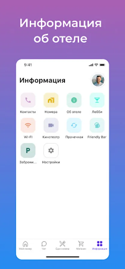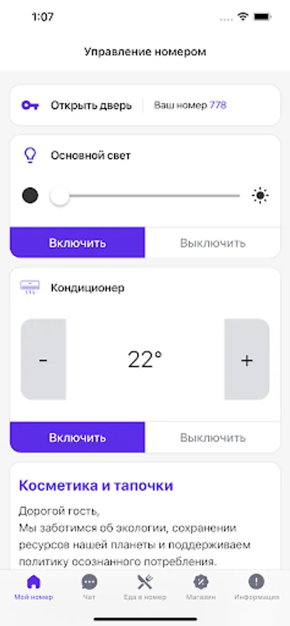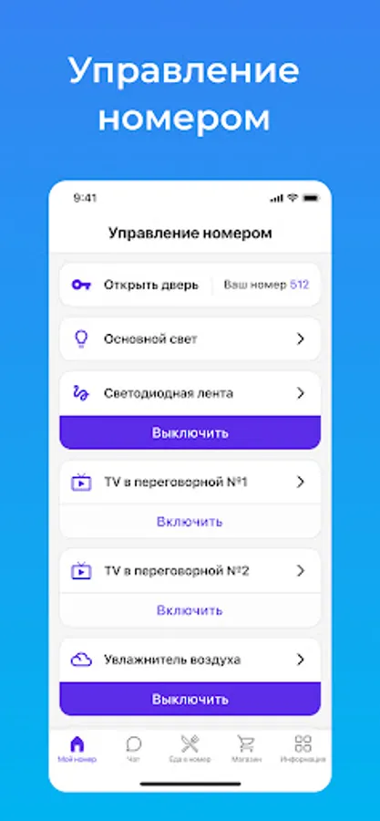 Take advantage of the range of additional services that will make your stay at the hotel as comfortable, convenient, functional and, of course, enjoyable as possible. With a mobile concierge, it's easy to control everything around: manage a room, order food, open / close a room, adjust lighting, communicate with staff, leave your wishes and just enjoy your stay at the hotel.