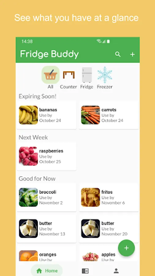 Ever have to throw out food because you left it in the back of the fridge for too long? Fridge Buddy can help! Scan receipts to quickly load in your groceries and get reminders for when your food is about to expire. You can also share what you bought with friends and family on our app so they get notifications too!