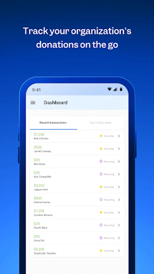 Funraise’s app is the easiest way for nonprofit organizations to collect in-person payments and stay updated with recent transactions, tasks, and supporter details on-the-go.