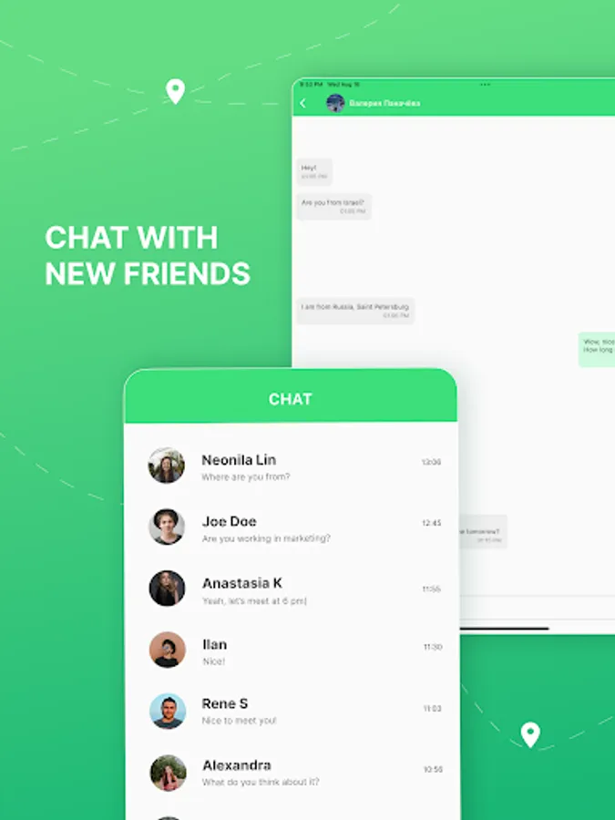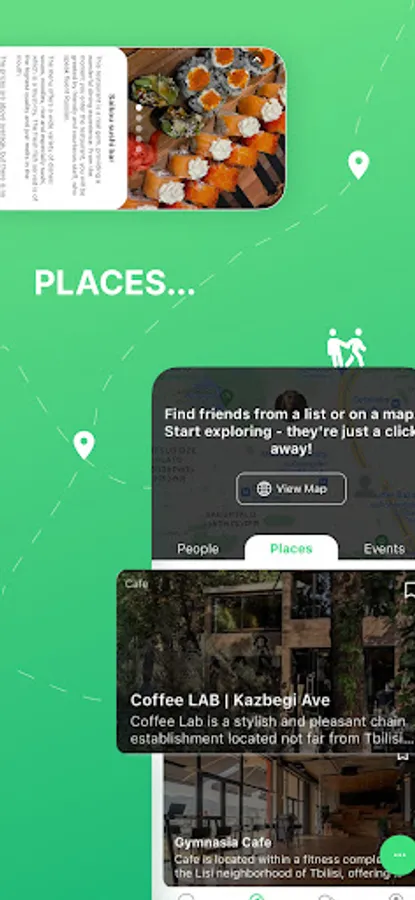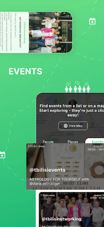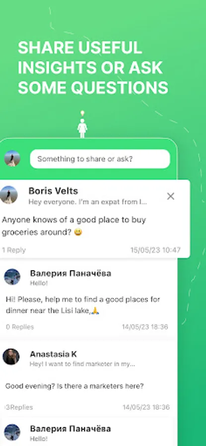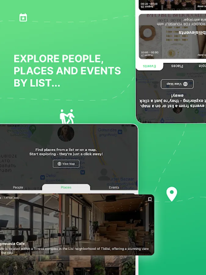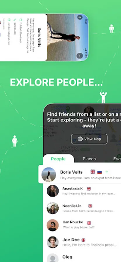Visit EXPLORE -> PEOPLE and start meeting other expats. Choose a convenient display format: list view and map view.