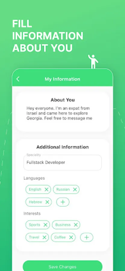 Expand your profile by telling more about yourself, outlining your interests and indicating the languages you're willing to communicate in. This will help you easily find "your people" and make meaningful connections.