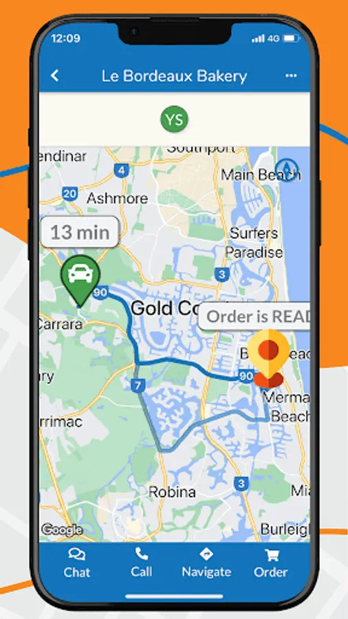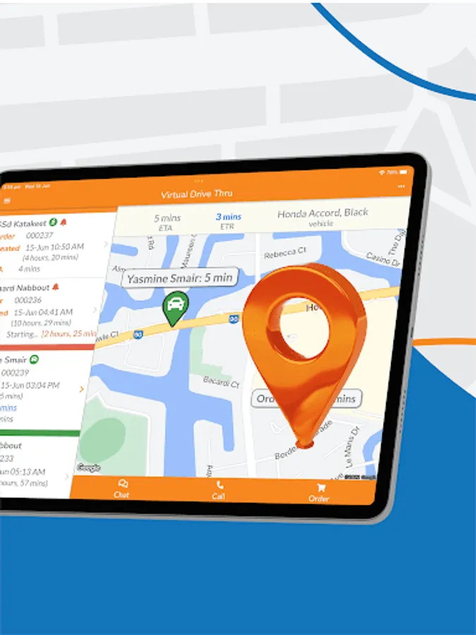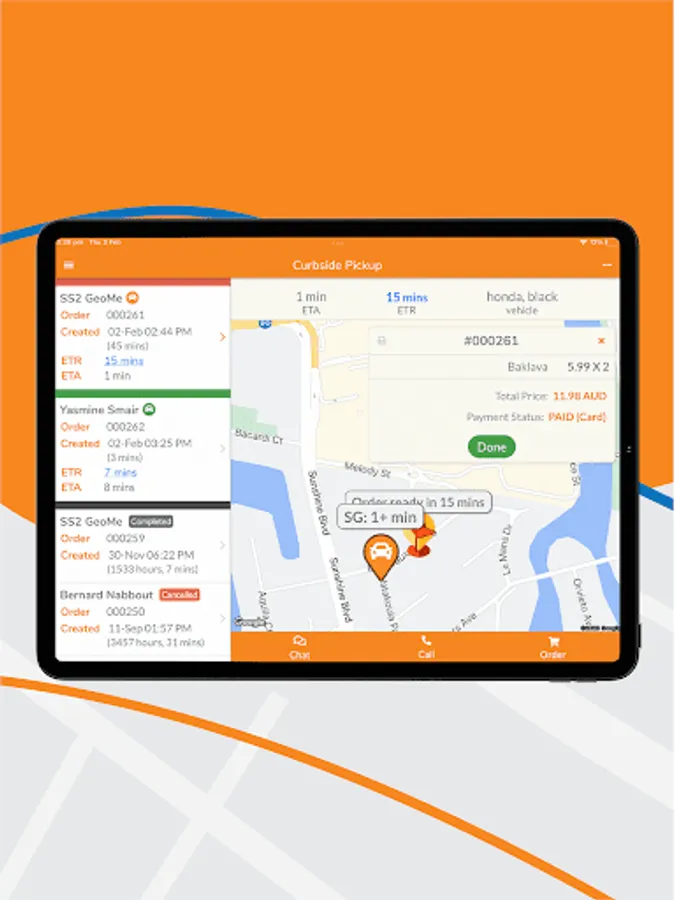 The business receives the order, tracks the incoming customer on the map along with the ETA (estimated time of arrival), prepares the order, and once notification of the customer arriving is received, the order is handed to the customer while in the car.