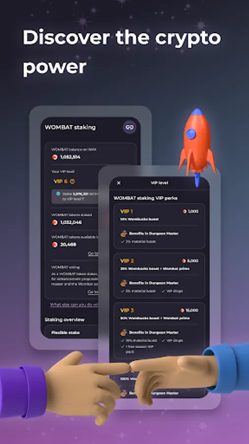 1. VIP Staking: Stake your WOMBAT tokens to get paid more crypto rewards and get exclusive NFTs for free.