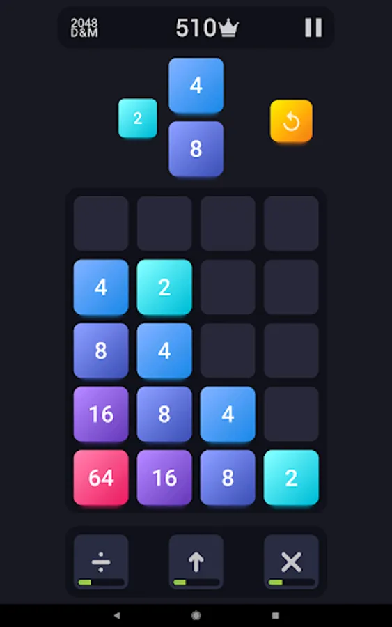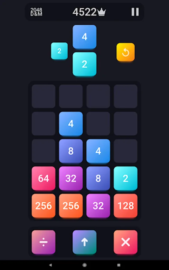 The game field consists of four columns with five cells each. Touch the empty cells to throw a tile in the column. Tiles will fall to the bottom or until they collide with other tiles. Tiles with two identical numbers will be merged into one tile with a double number. In 2048 game mode you can pick up the topmost tiles in the columns and move them to another column, but not more than one tile at a time. When you pick up the topmost tile, it moves to the tile dispenser and becomes the current tile along with the one that is there at that moment. When there are two current tiles in the dispenser, the lower tile will fall into the column you touch, and the upper tile into another column, if possible. In 2048+ mode, you cannot pick up the top tiles by touching them. In 2048+ mode, adjacent identical tiles will merge not only vertically, but also horizontally.