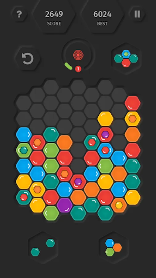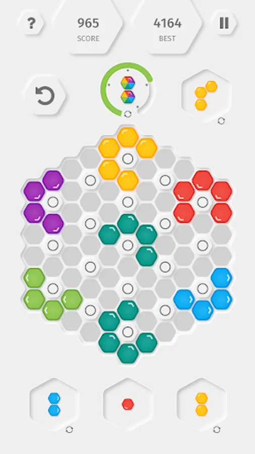 Place shapes to the game field. Make rings of the same color. These rings of tiles will be cleared and you get score points. Rotate shapes to find the best position. You can store one shape for later use and you can undo the last move. Clear the rings to get multicolor shapes and the bomb. Place the bomb to center of any ring to clear the tiles around it. The game continues as long as you can place shapes. Try to get as many points as you can.