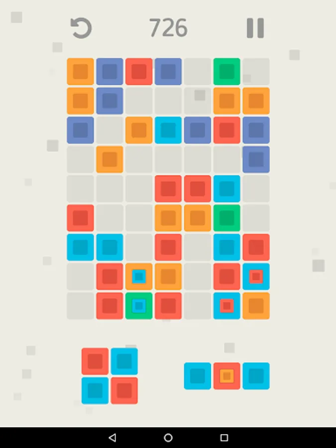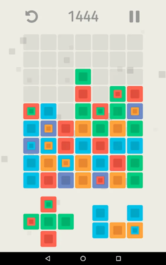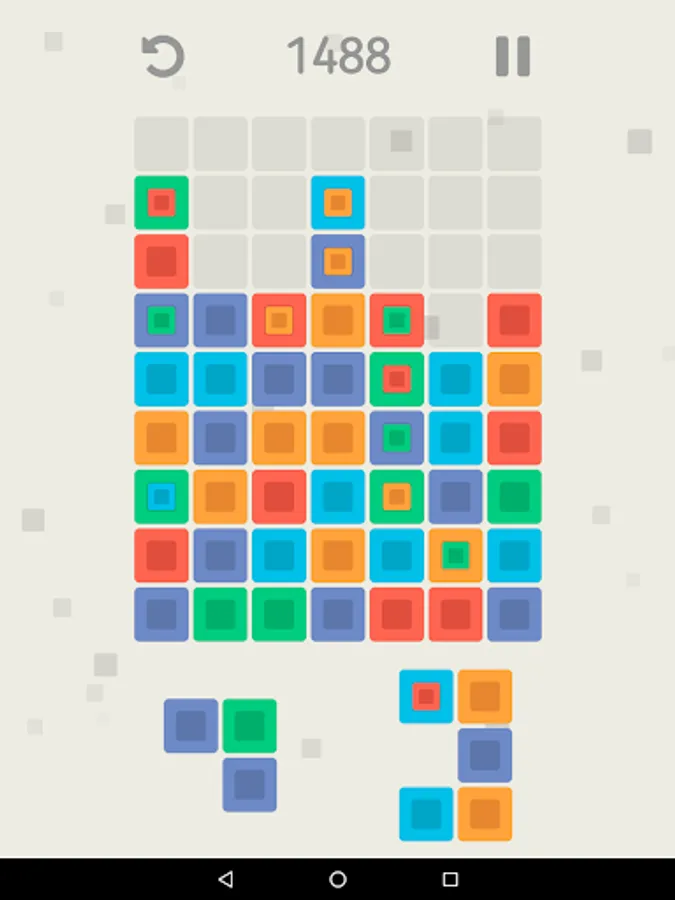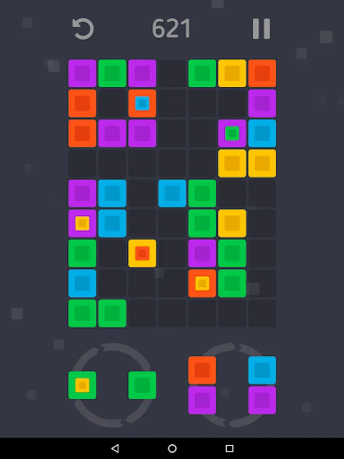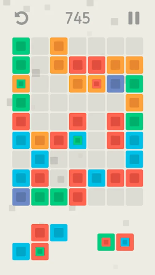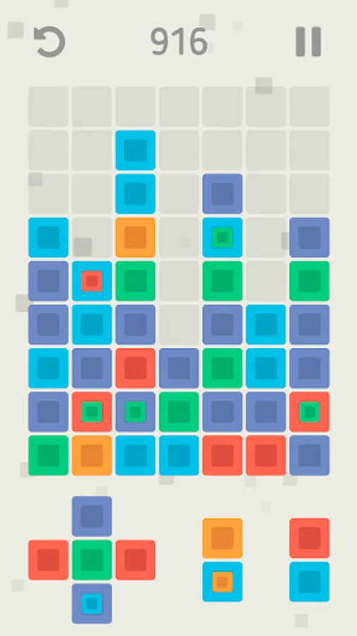 Your goal is to place the shapes of color blocks on the game field and create groups of three or more blocks of the same color that will be deleted and make space for new blocks. The more blocks you remove at once, the more game points you will get. At the beginning of the game all the shapes consist of blocks of the same color, but with score growth will appear blocks containing another blocks of a different color. After the removal of such blocks, the internal blocks will increase and occupy the places of the removed blocks. Did you make the wrong move? Use the undo button to undo your last move. Your game is automatically saved when you exit, so you can interrupt at any time and continue the game from the same place. Your goal is to survive as long as possible and score as many points as possible.