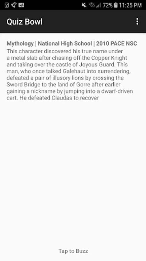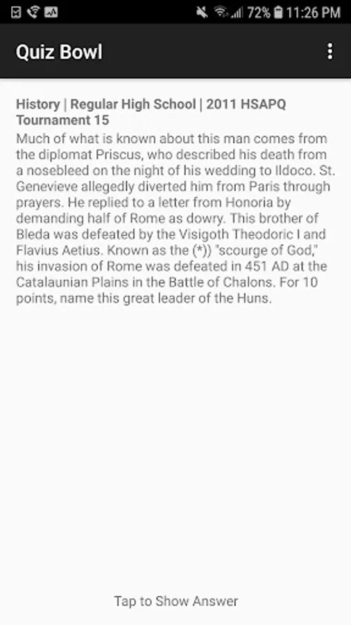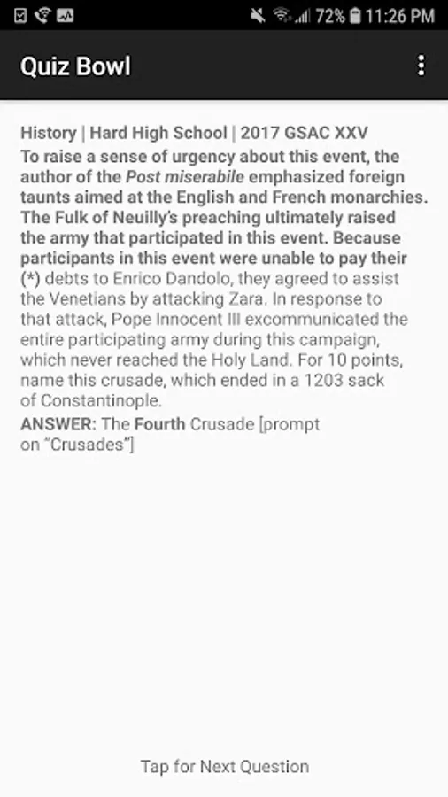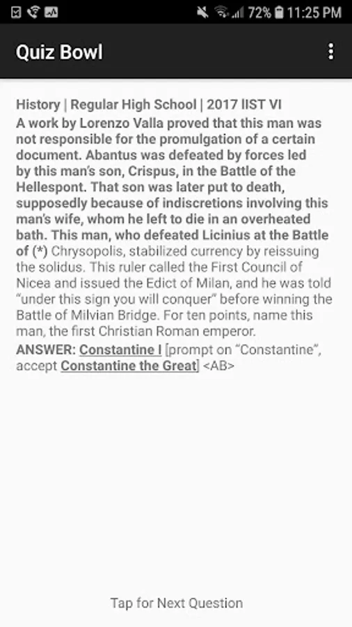 Using Raynor Kuang's QuizDB database of over 90,000 quiz bowl questions, improve your game through offline study at home or on the go. The question presentation mimics the competition experience, letting you practice like you'll play. Filter by category and difficulty to prepare both broad topics and precise specialties.