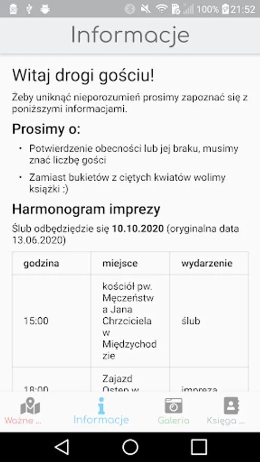 There you will find practical information about the wedding and reception. The application also allows sharing photos with the bride and groom, and an entry in the virtual guest book.