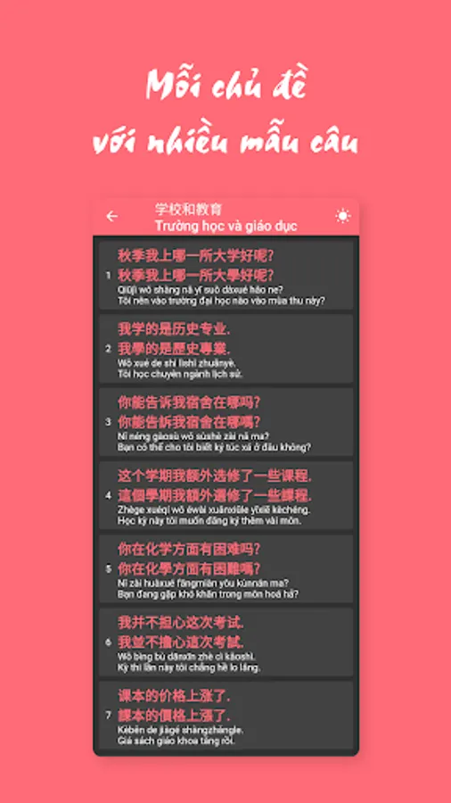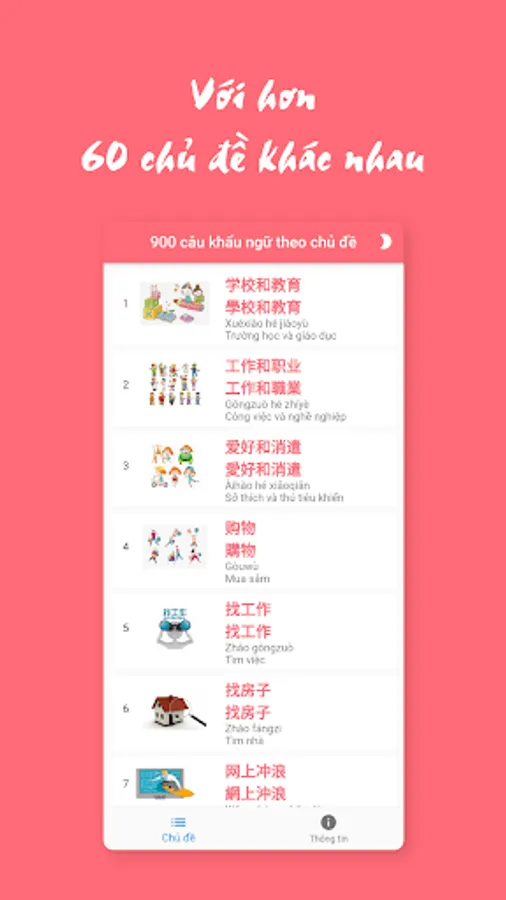 Meticulously collected over 60 other topics, and nearly 900 sentences with bilingual Vietnamese - Chinese, including simplified - traditional and pinyin.