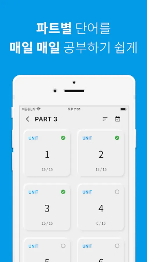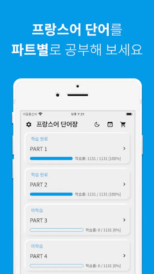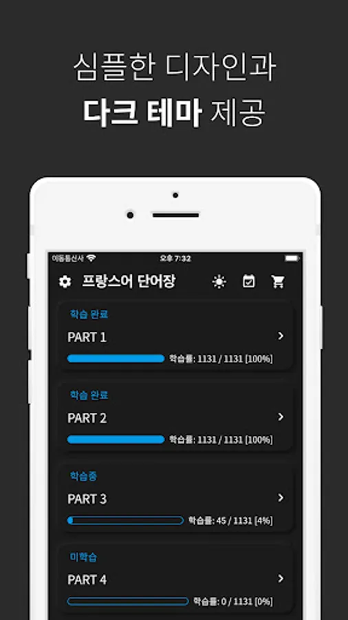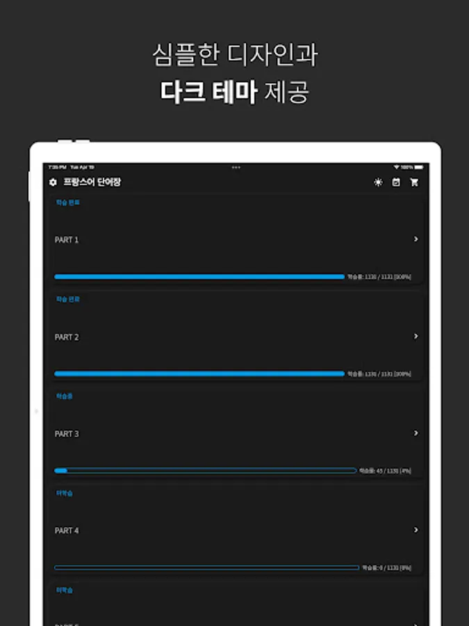 - Set/reset learning progress: Long press on a part or unit to set or reset the learning progress.