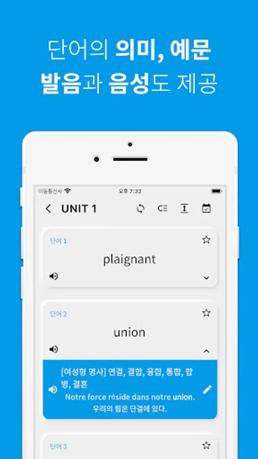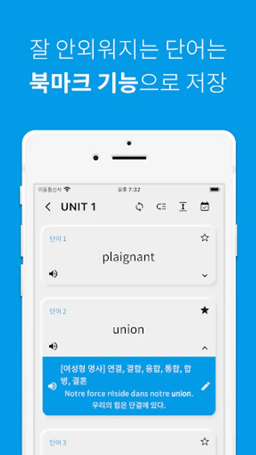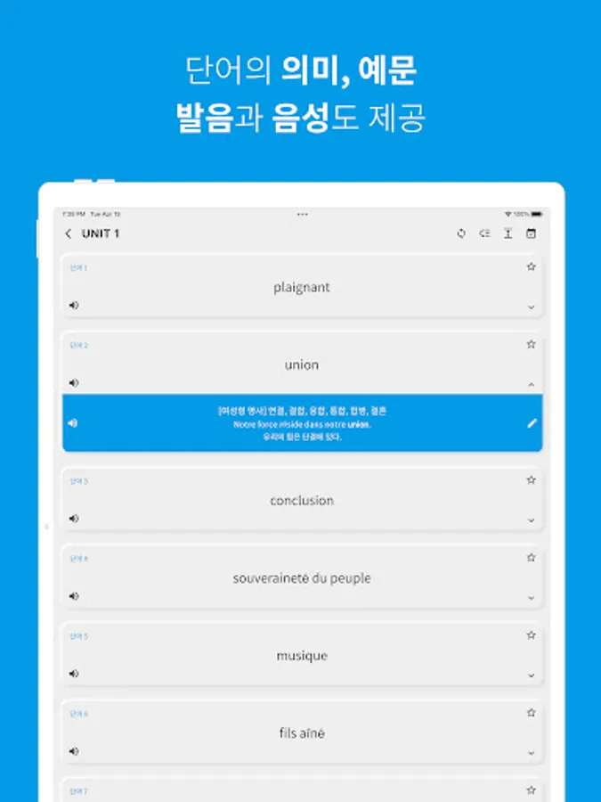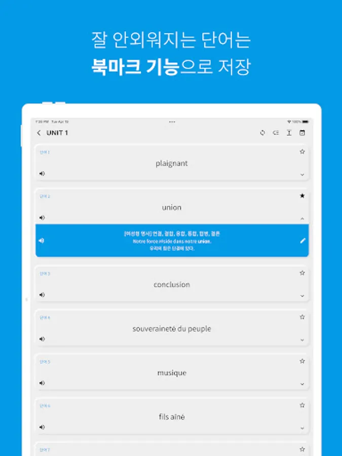 Studying words is also repetition! You can review the studied French word by part, unit, or whole unit.