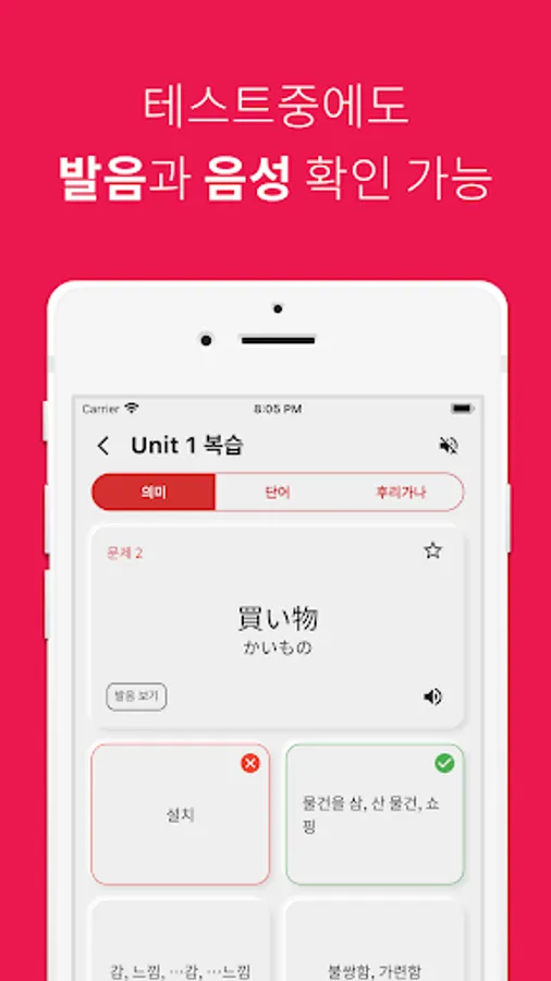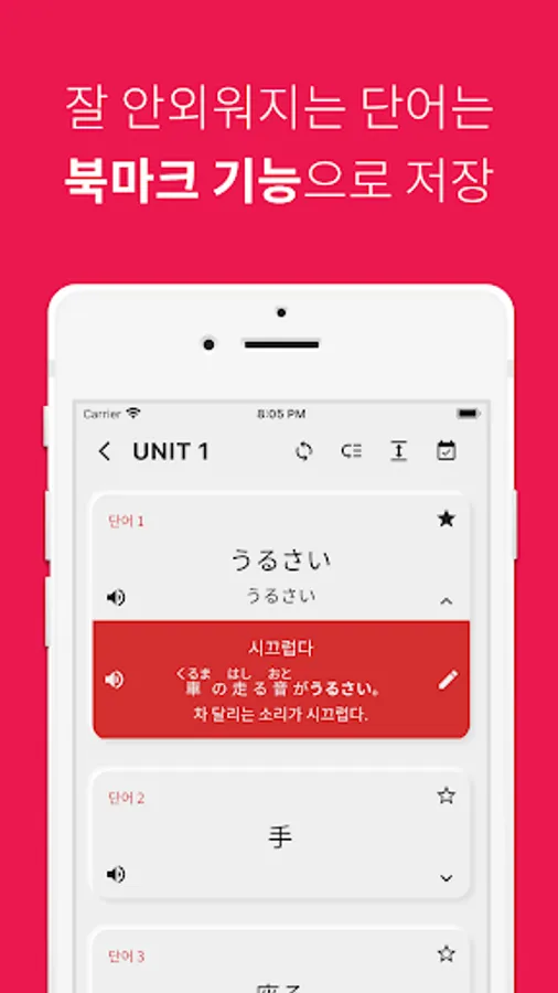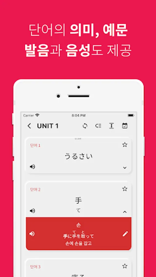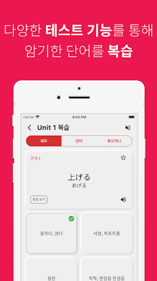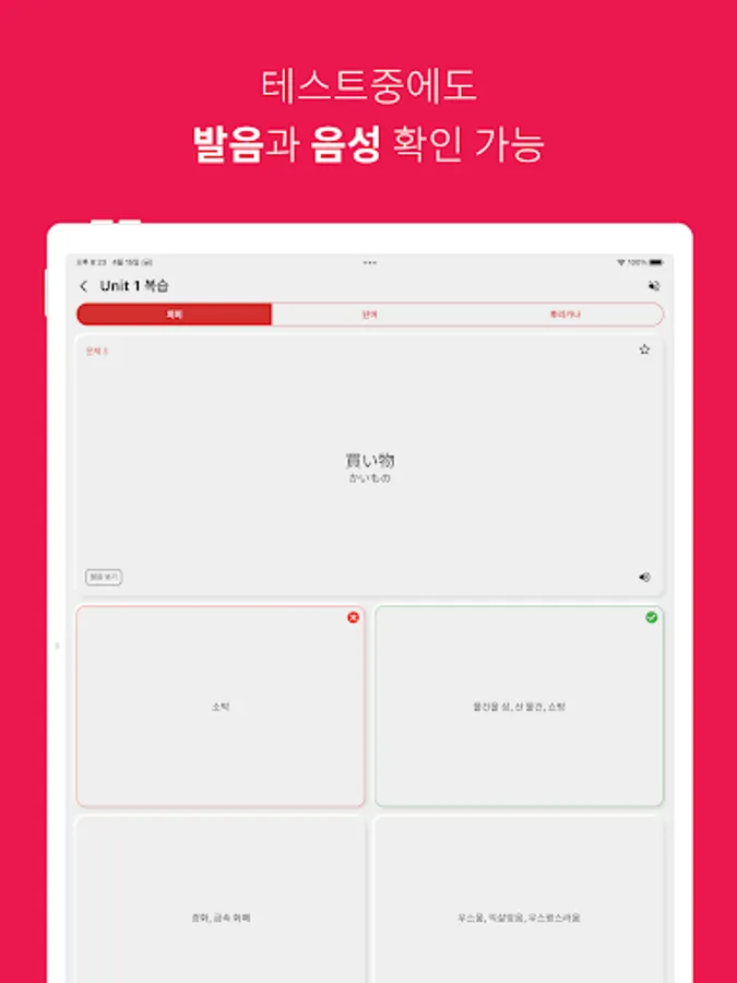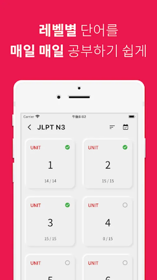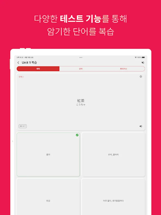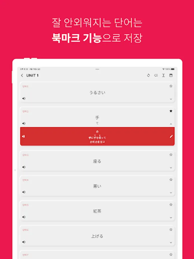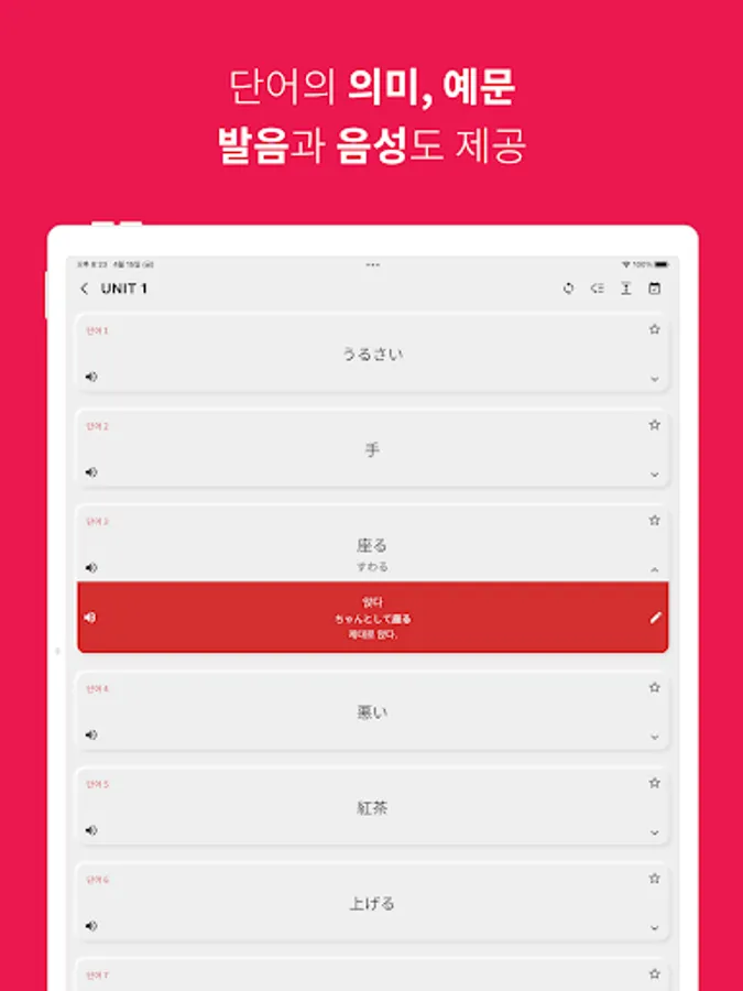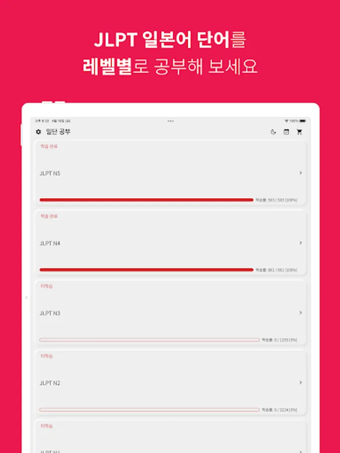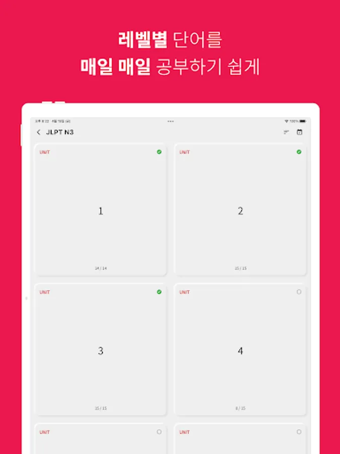Studying words is all about repetition! You can review the Japanese words you studied by unit, JLPT level, or entire unit.