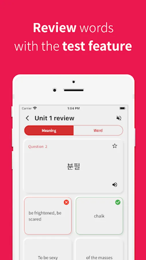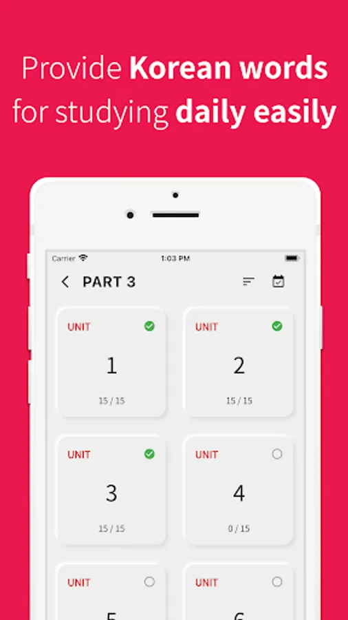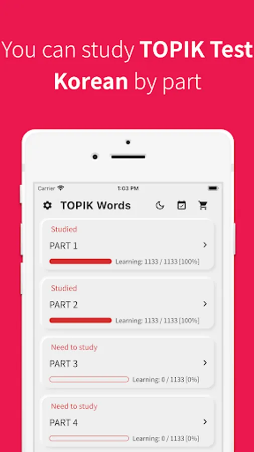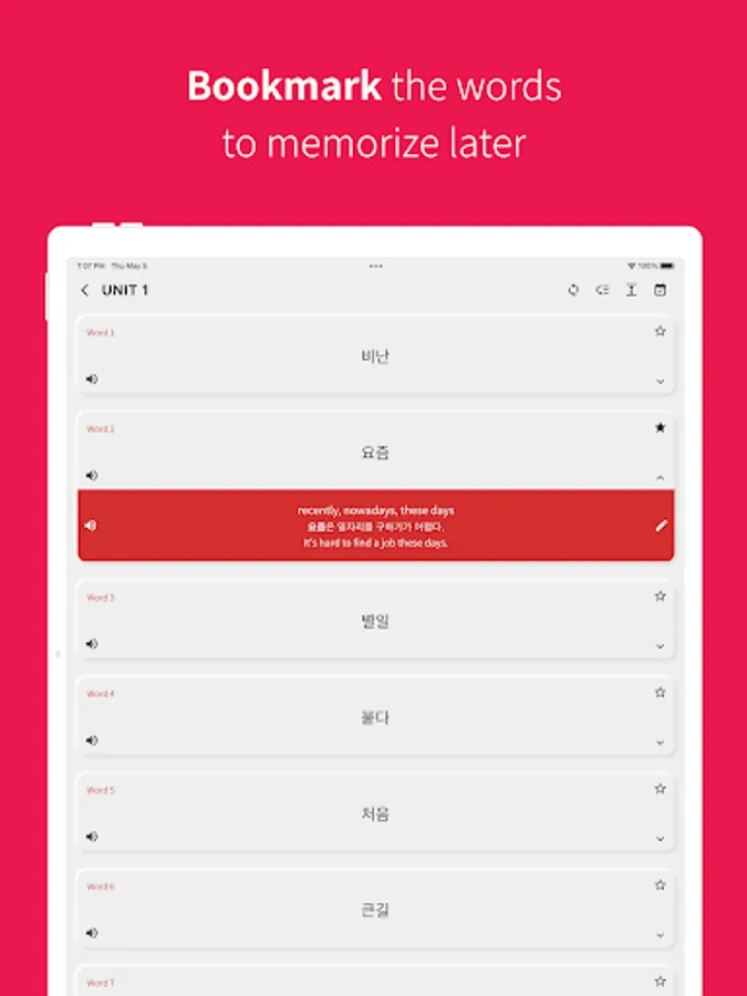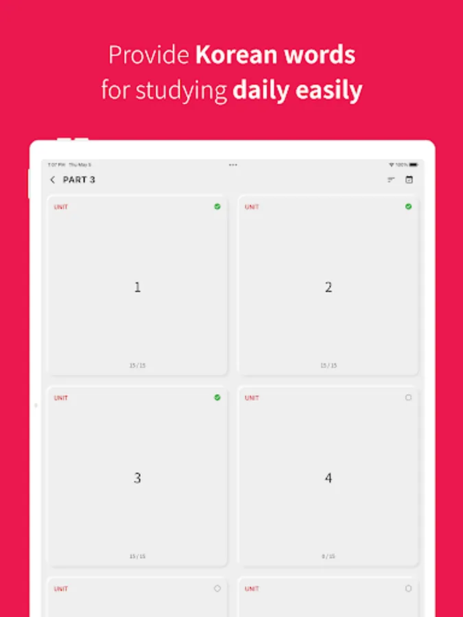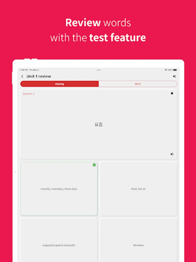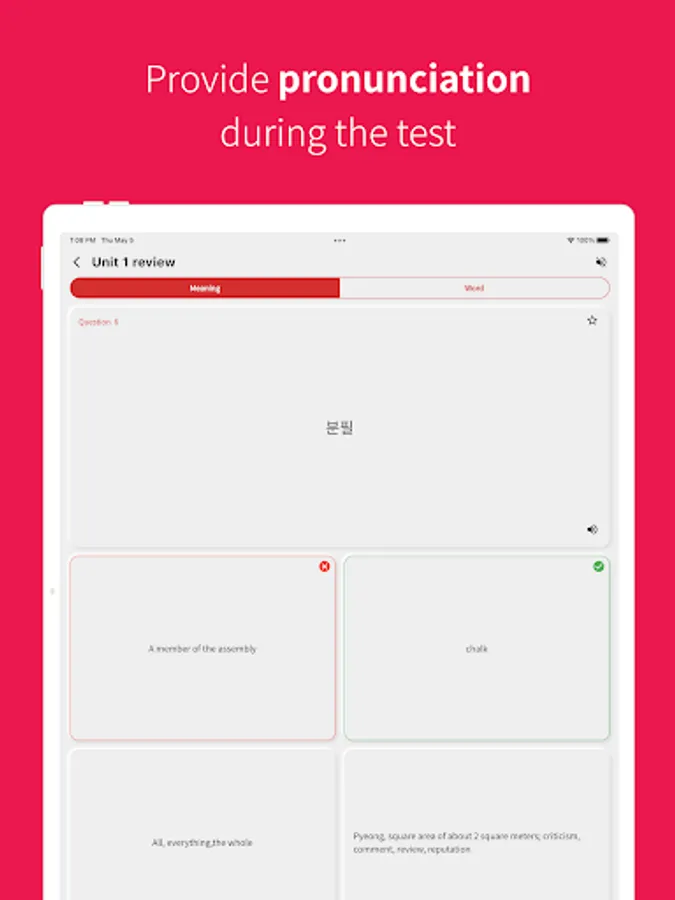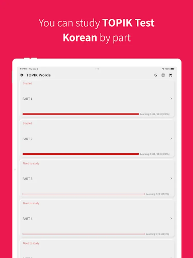 It is important to study words every day! You can review the studied Korean vocabulary by part, unit, or whole words.