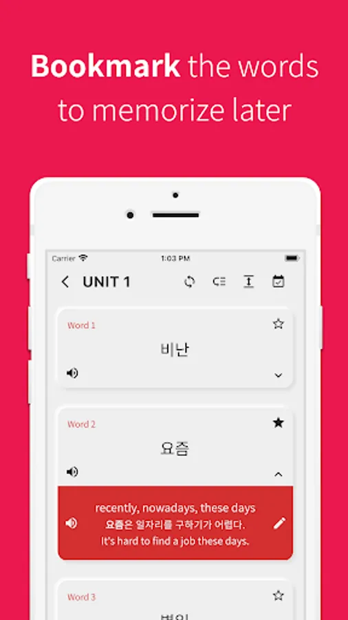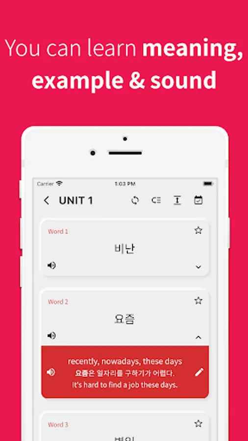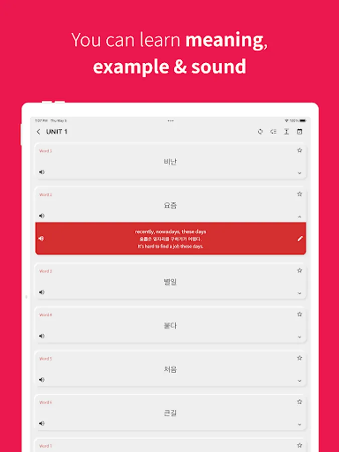 All words are installed with the app when you download the app. So you can study Korean vocabulary anytime and anywhere.
