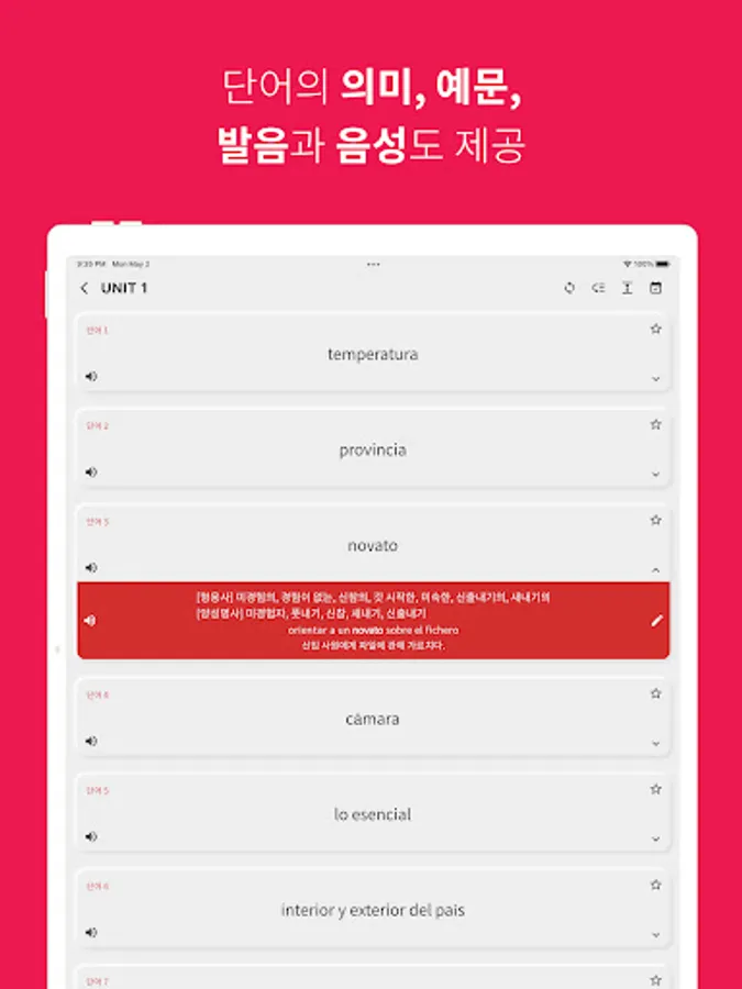 Every word is installed with the app when you download it. So you can study Spanish words anytime, anywhere.
