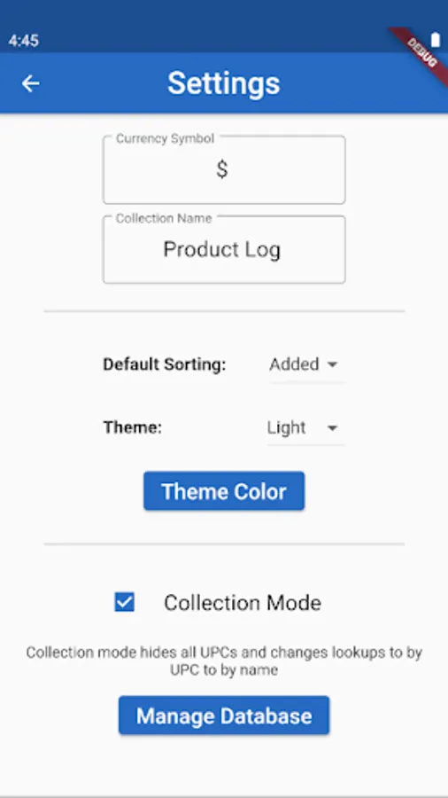 Users can change a few settings to customize their experience. These settings include changing between light and dark mode, changing their primary color, changing the collection name, changing their currency symbol, and managing the database. Users can backup or import their SQLite databases here. Users can also toggle collection mode.