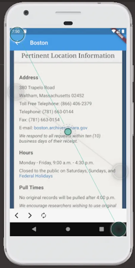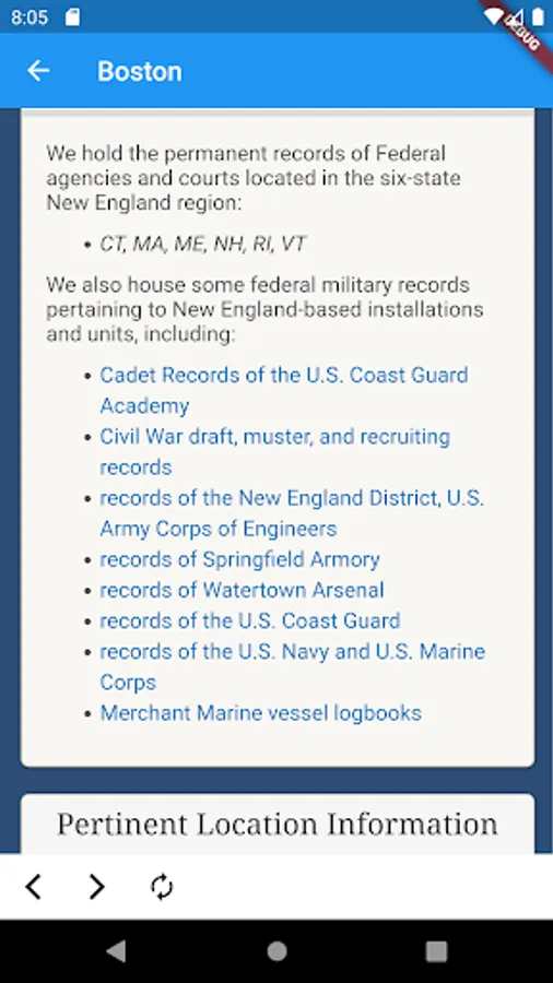 Located in Waltham Massachusetts, Boston NARA branch is a small, specialized regional archive. The App provides visitors to the National Archives (NARA) Boston branch with: