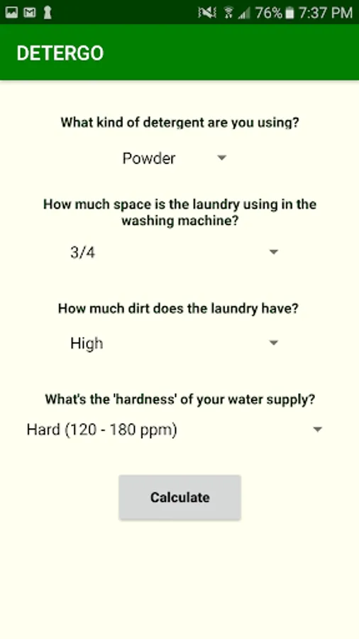 DETERGO is an open-source offline app designed to aid people estimate how much laundry detergent is needed to wash their clothes and other laundry in a washing machine. The app supports three detergent types: pods (like Tide PODS), liquid (like Arm & Hammer Essentials), and powder (like Tide Powder).