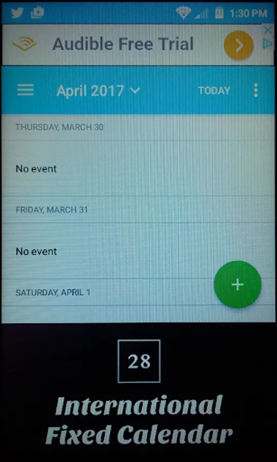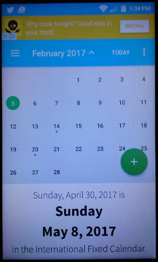 The layout from top to bottom is an ad banner on top, the Gregorian Calendar with event planning and then the International Fixed Calendar conversion along the bottom.